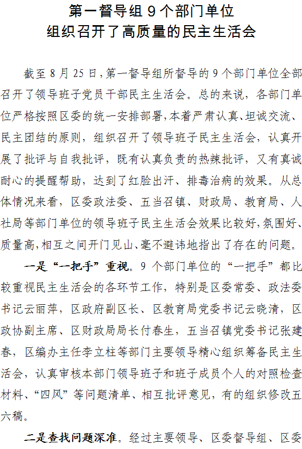第一督导组各部门认真组织召开民主生活会